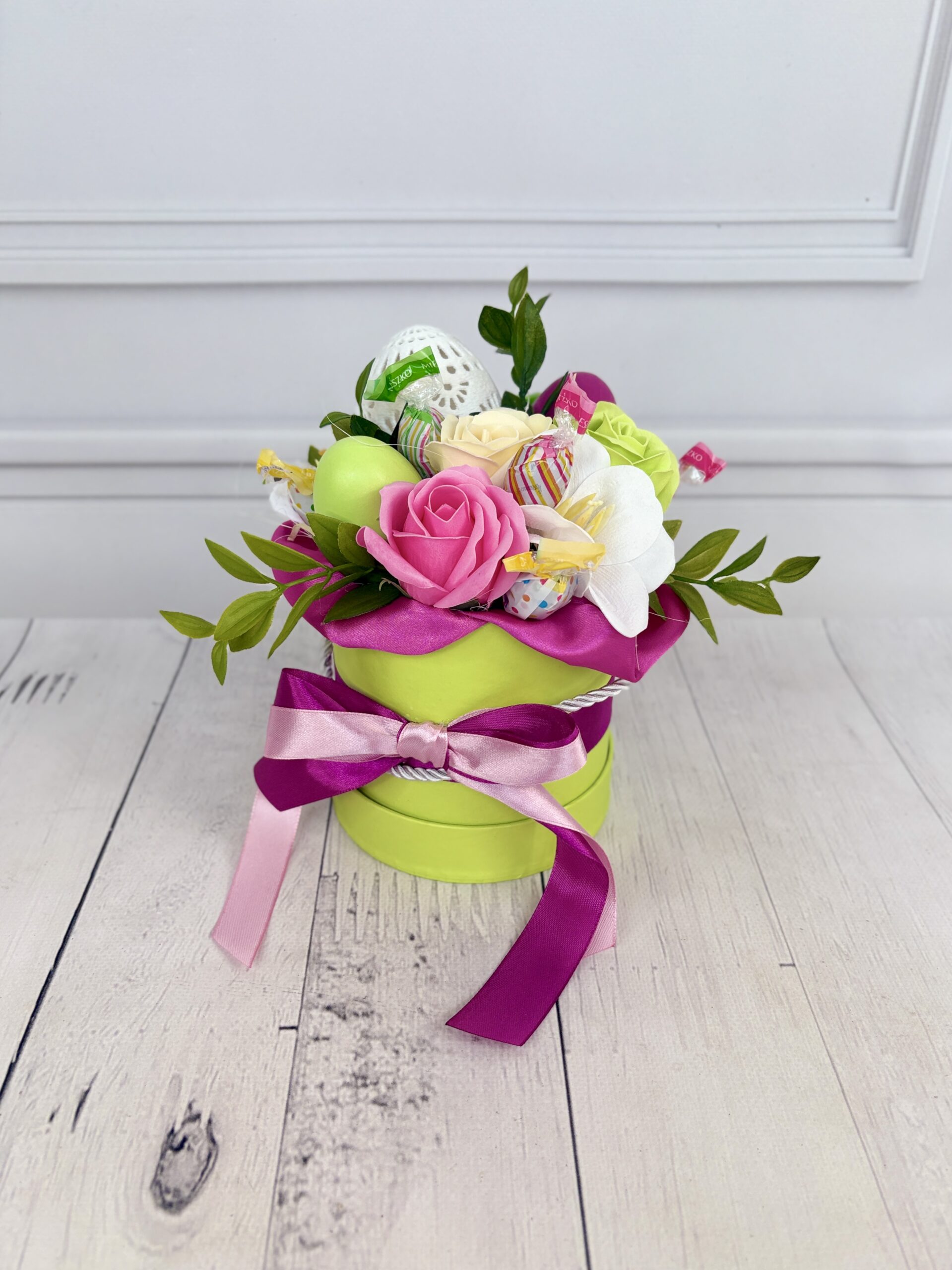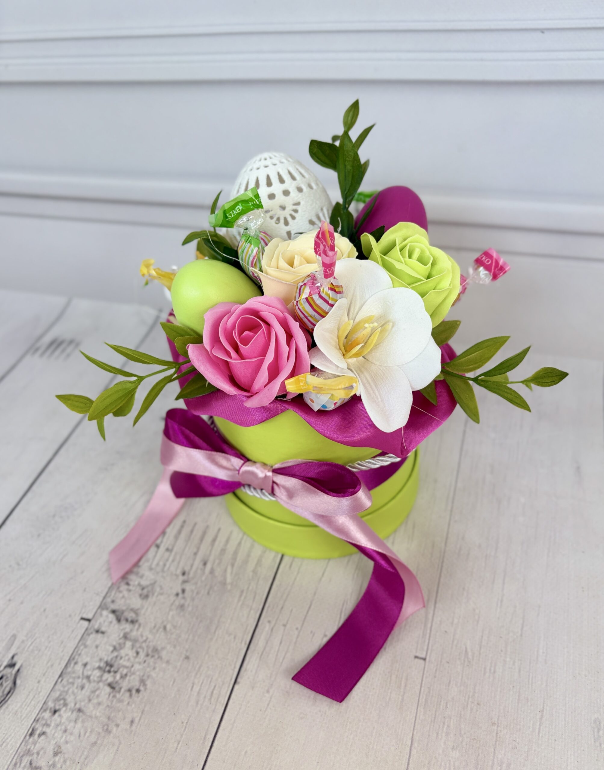 Kompozycja została stworzona z myślą o lekkości i wiosennym klimacie – delikatne kwiaty dekoracyjne, pastelowe dodatki oraz naturalne akcenty tworzą harmonijną i przyjemną dla oka całość 🌿