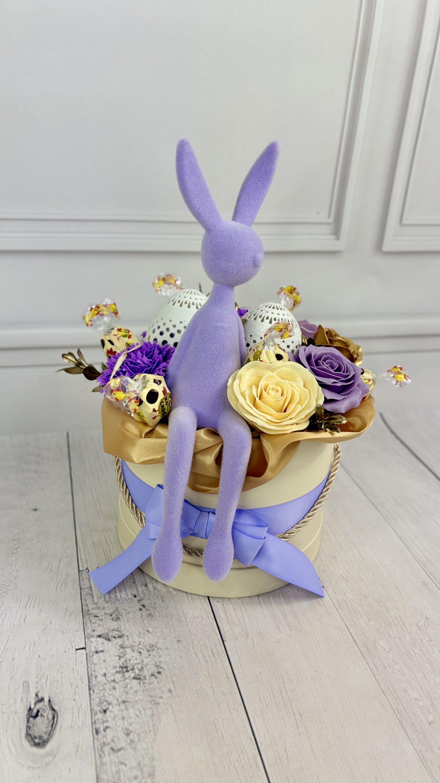 Centralnym elementem kompozycji jest dekoracyjny zajączek w delikatnym, welurowym wykończeniu, który nadaje całości wyjątkowego, stylowego charakteru i przyciąga uwagę swoją formą.
