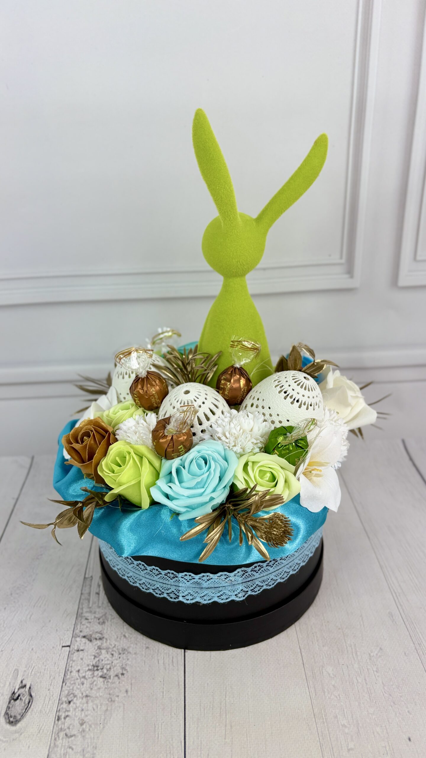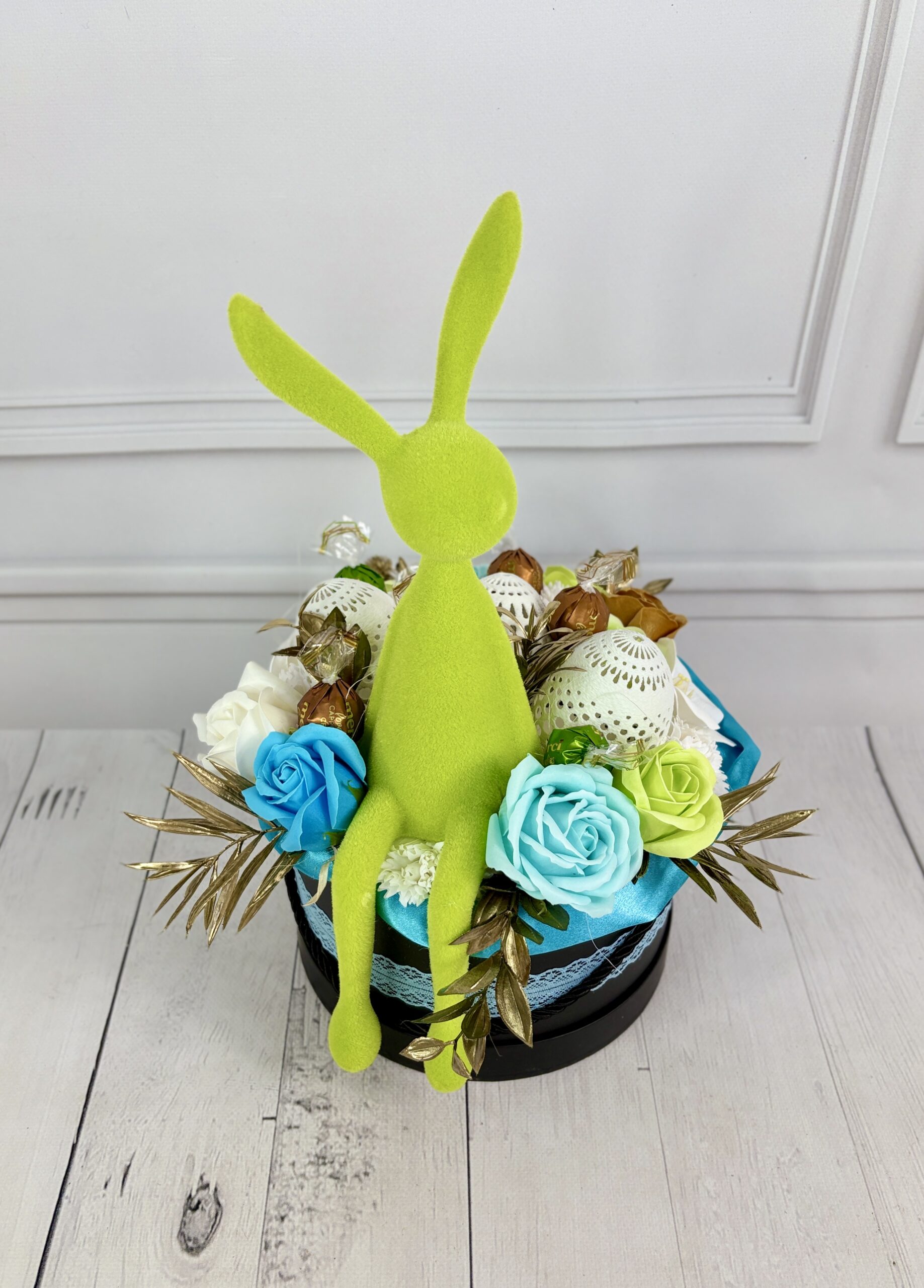 Centralnym elementem kompozycji jest dekoracyjny zajączek w wyrazistym, welurowym wykończeniu, który nadaje całości unikatowego charakteru i przyciąga uwagę już od pierwszego spojrzenia.