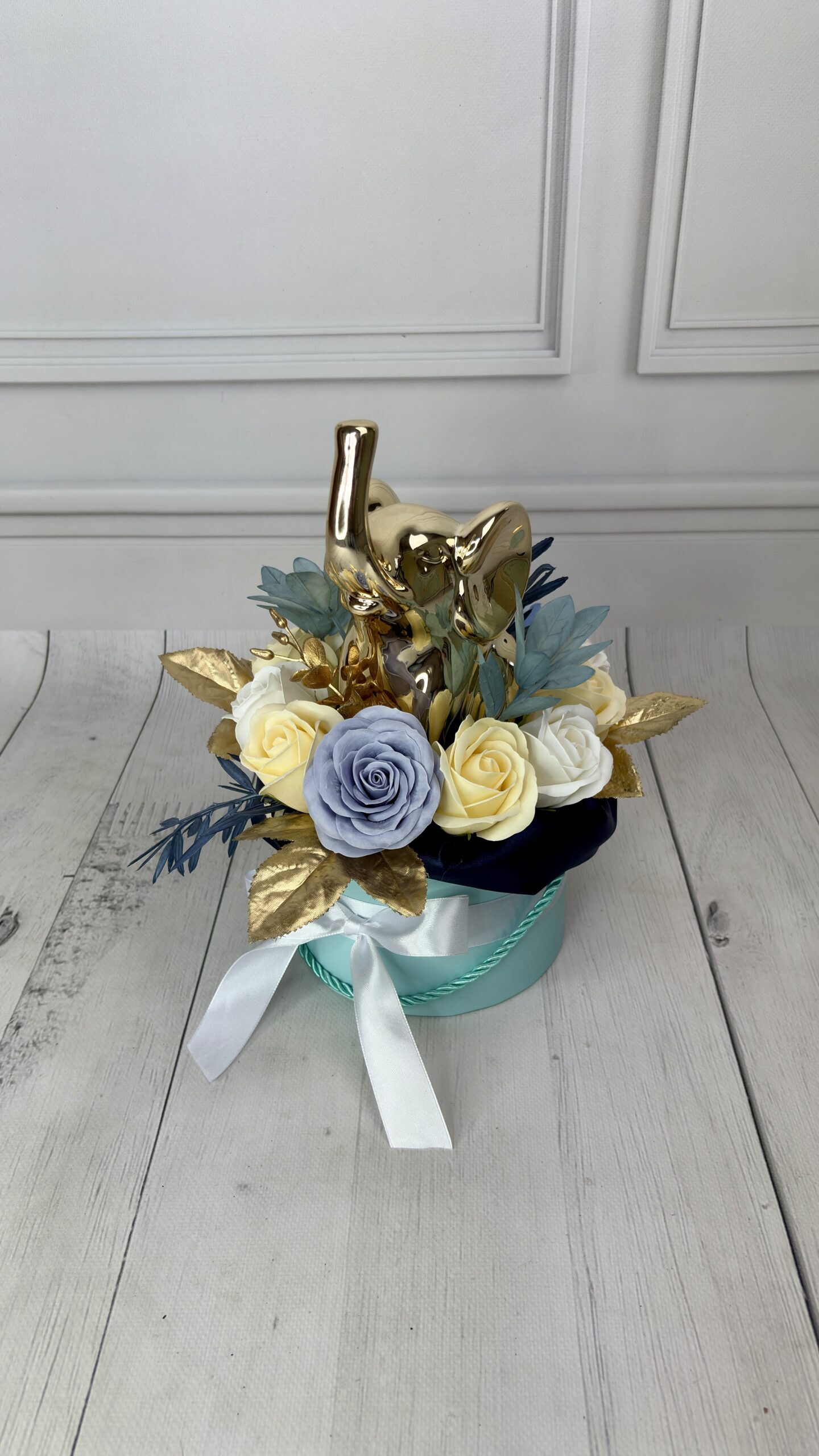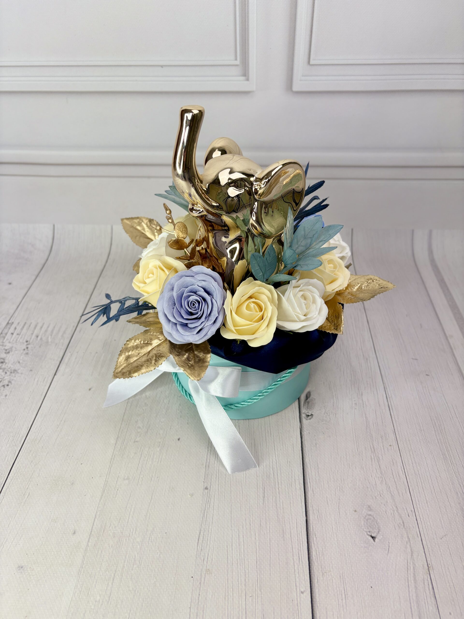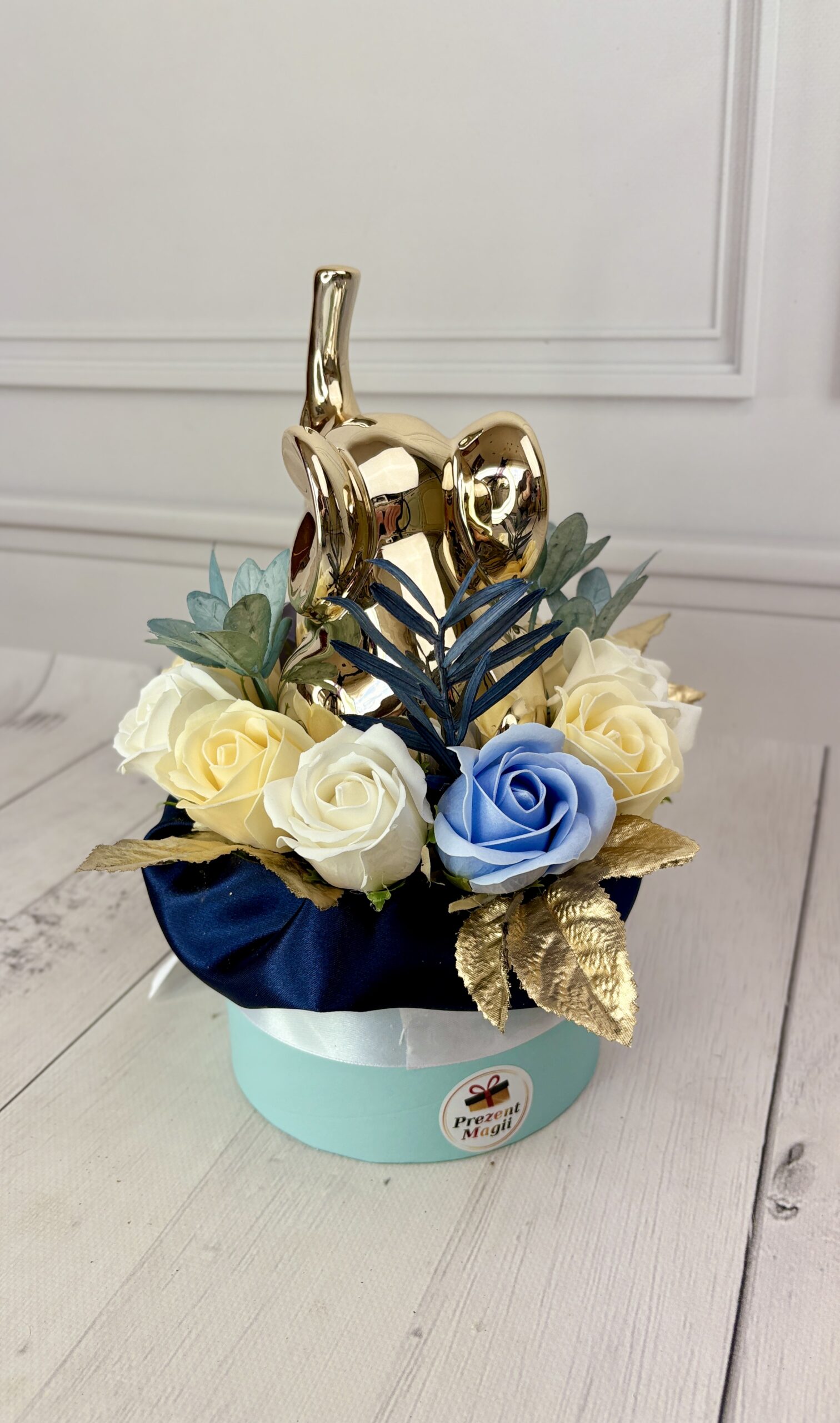 Centralnym elementem jest złoty słonik – symbol szczęścia, pomyślności i dobrych emocji, który nadaje całości wyjątkowego charakteru 💛