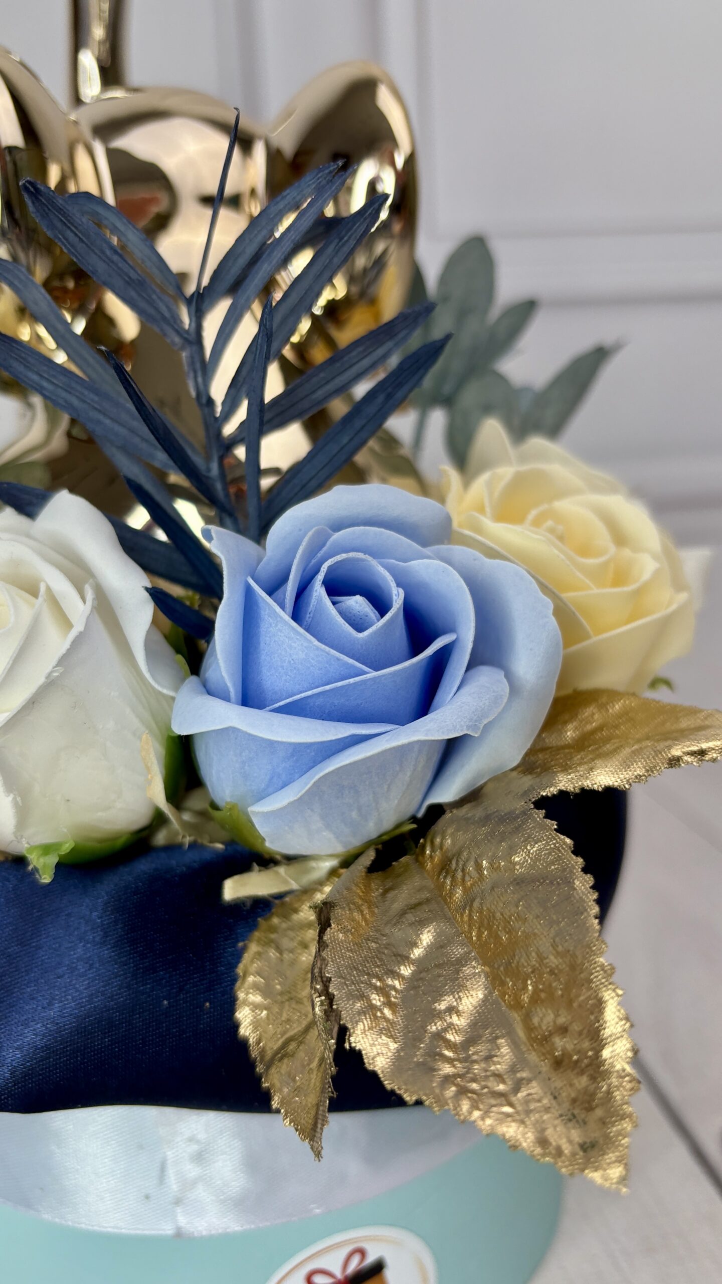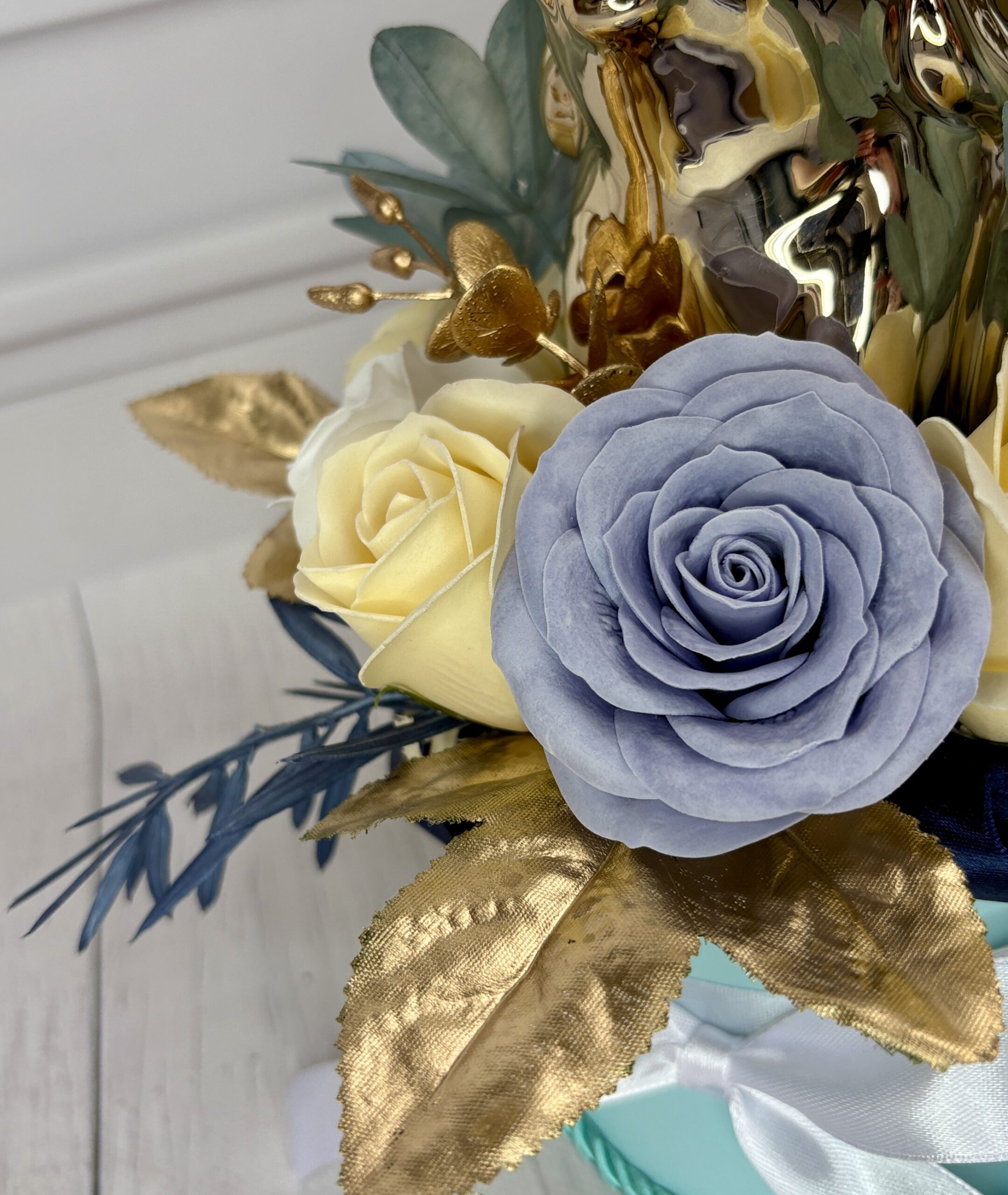 Kompozycja została stworzona z róż mydlanych, które zachwycają swoim wyglądem i trwałością – nie więdną, dzięki czemu dekoracja cieszy oko przez długi czas 🌸