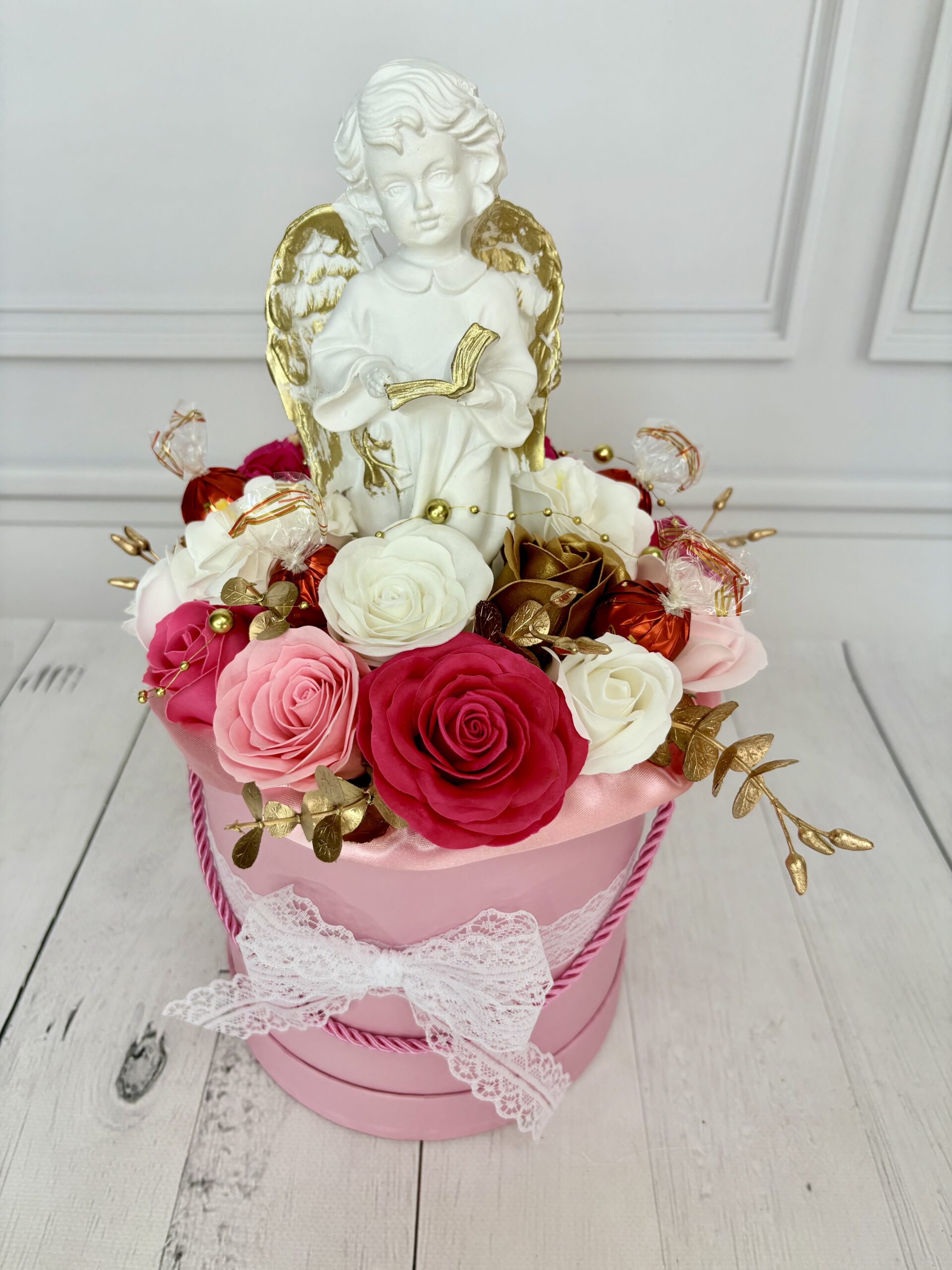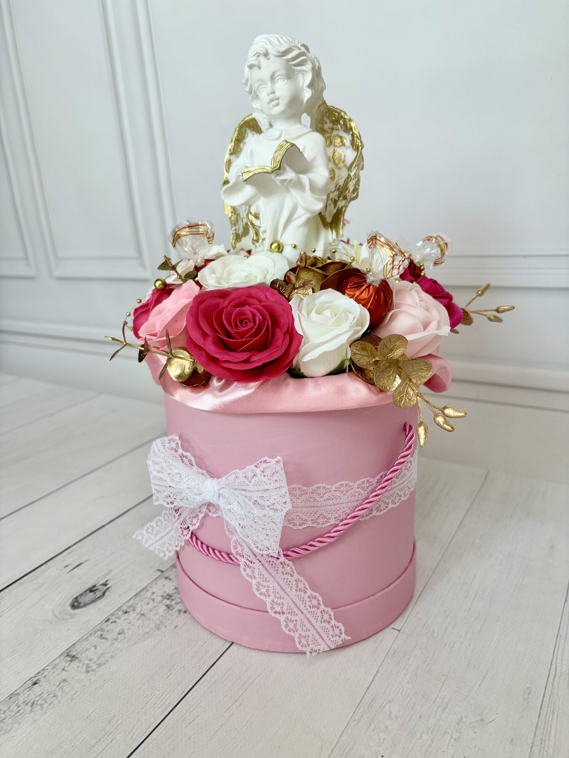 Bogata kompozycja została wykonana z wysokiej jakości kwiatów mydlanych, które zachowują swój piękny wygląd na długi czas. Całość uzupełniają czekoladki Merci, tworząc elegancki i gotowy do wręczenia prezent.