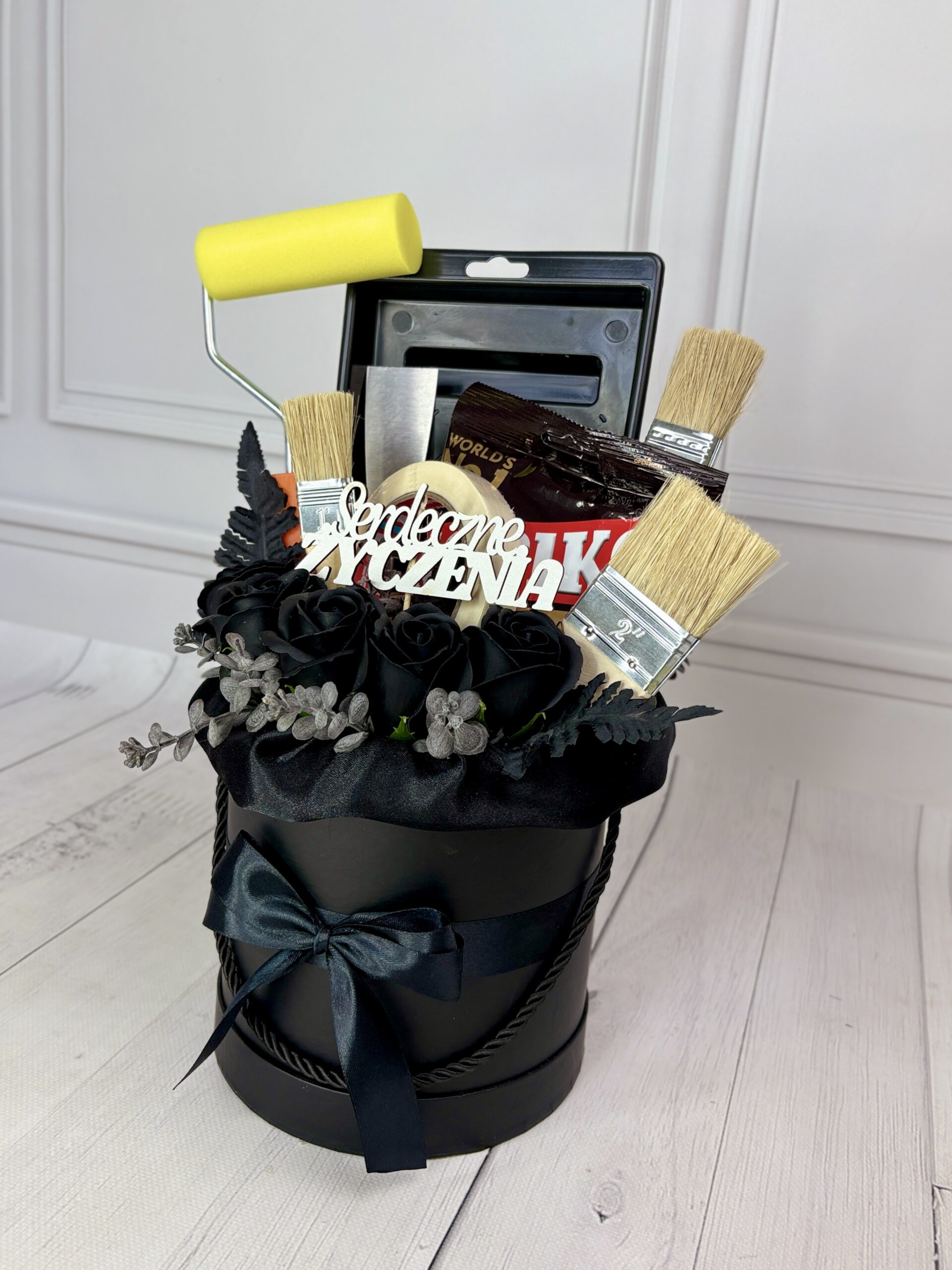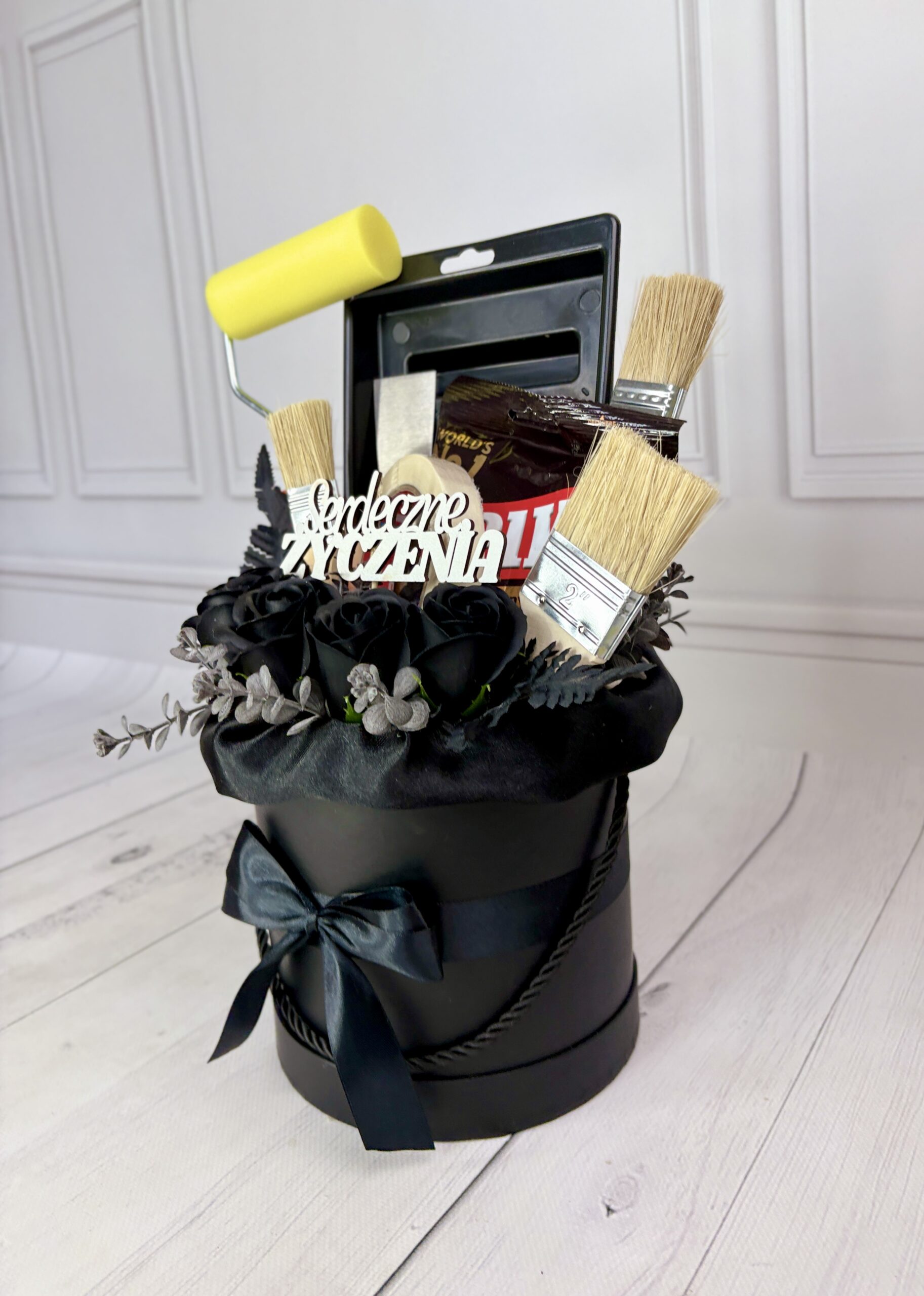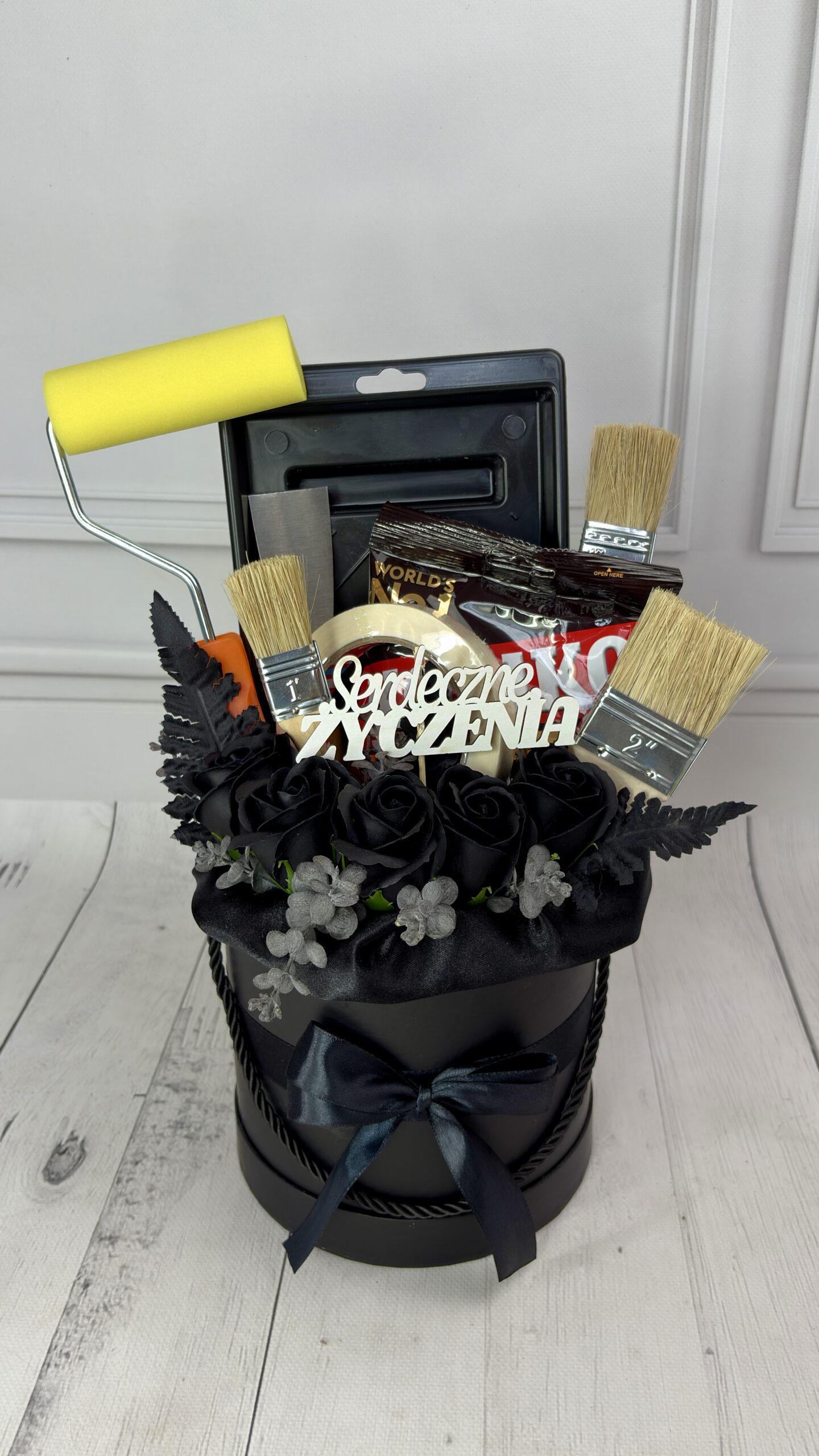 Kompozycja została stworzona z myślą o osobach związanych z pracami wykończeniowymi – róże mydlane, akcesoria malarskie oraz dekoracyjne dodatki tworzą spójną i efektowną całość 🖤