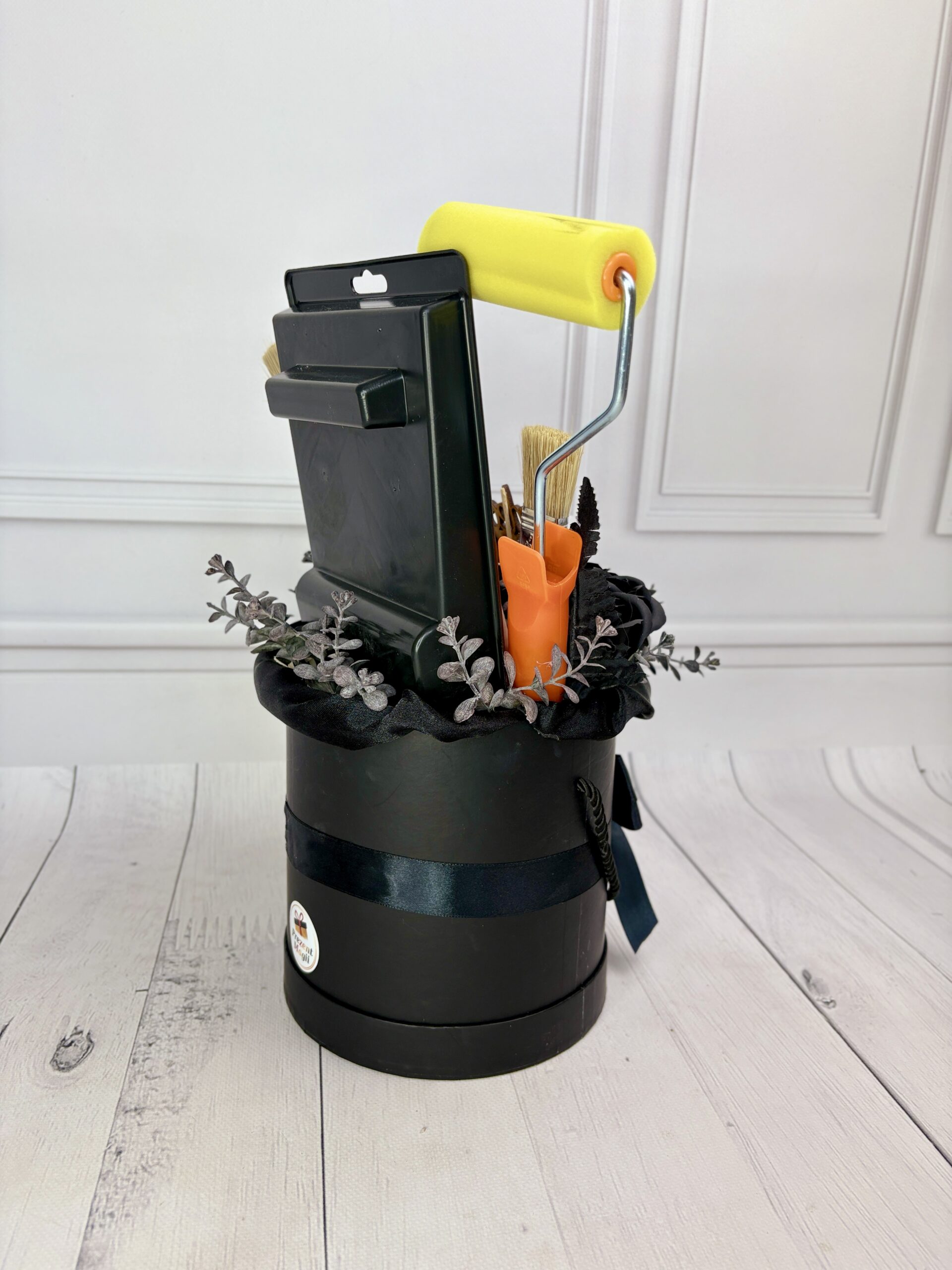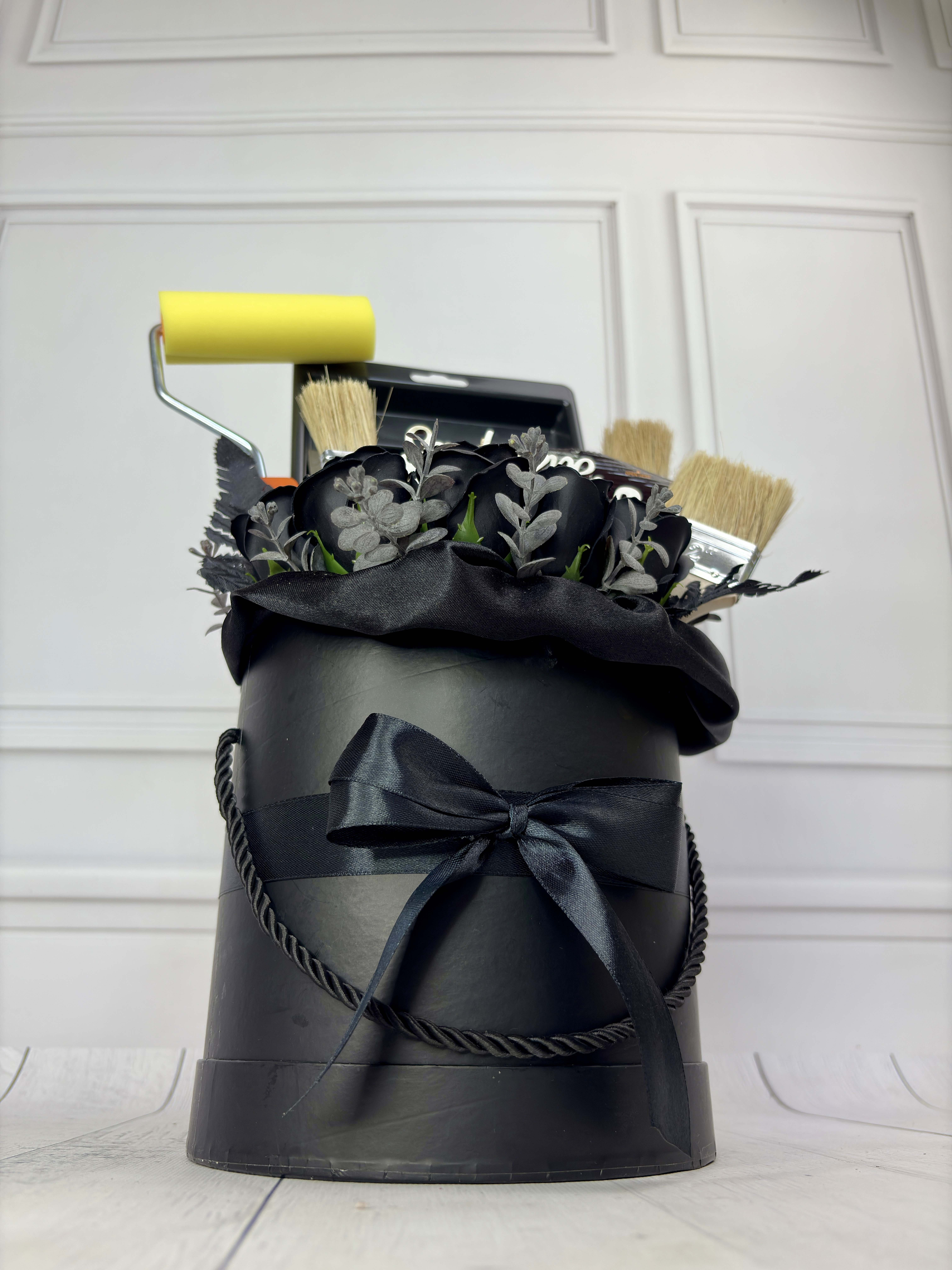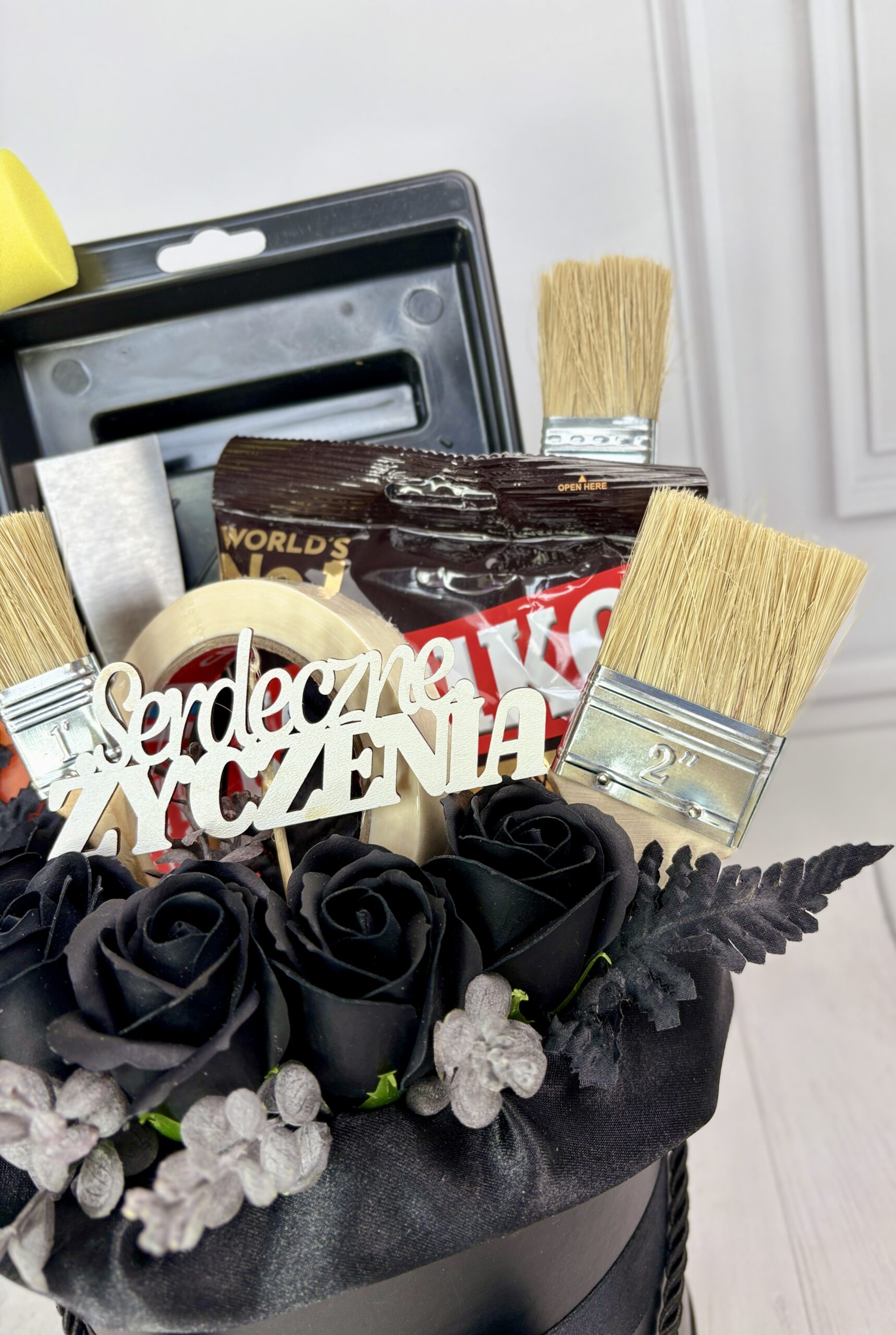 Kompozycja została stworzona z myślą o osobach związanych z pracami wykończeniowymi – róże mydlane, akcesoria malarskie oraz dekoracyjne dodatki tworzą spójną i efektowną całość 🖤