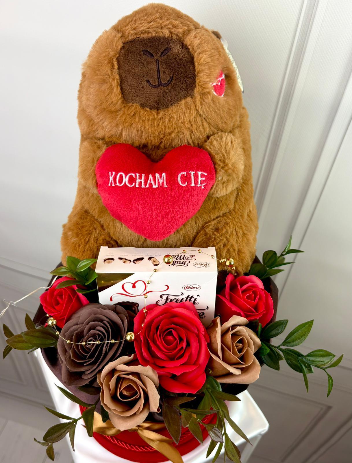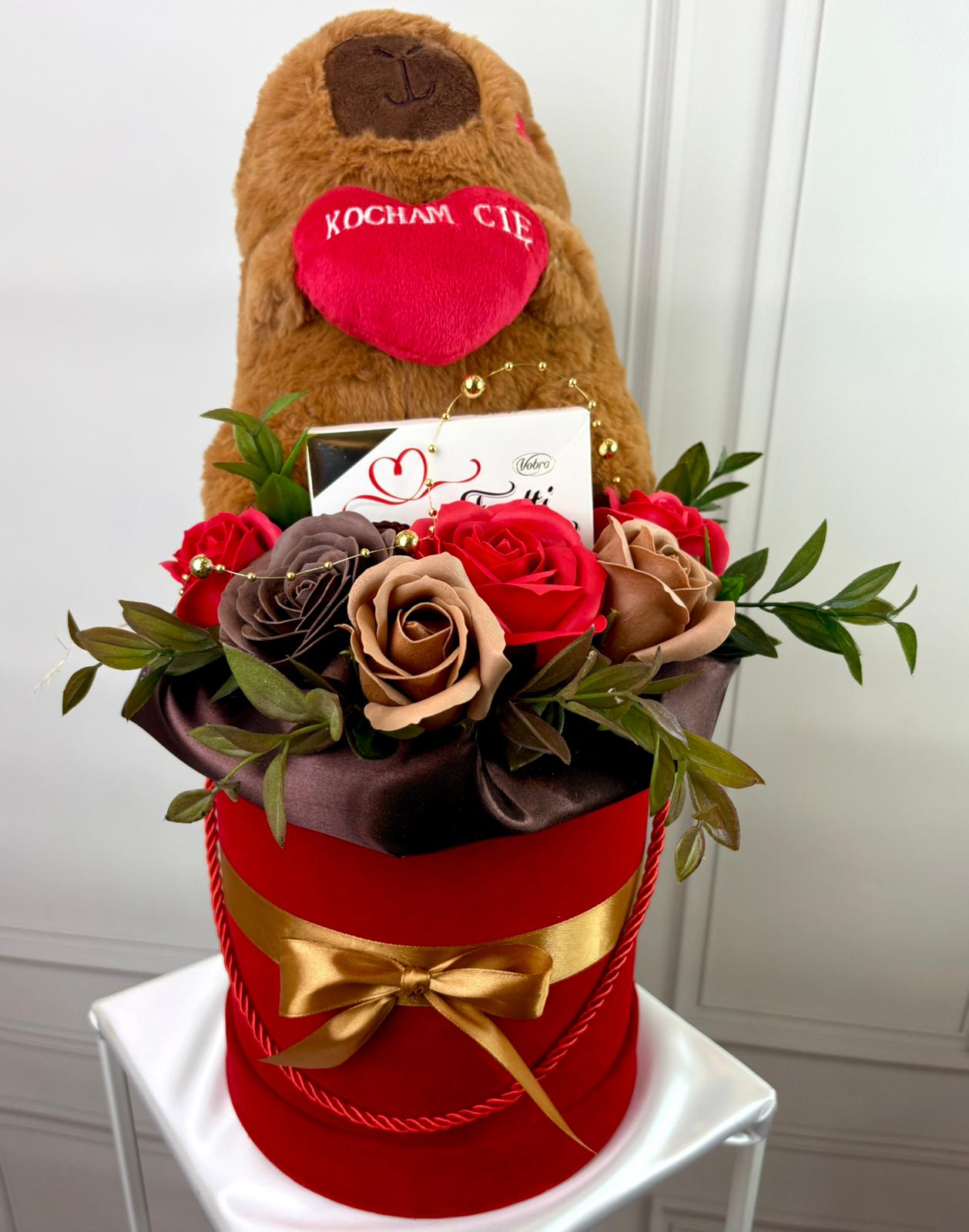 Uroczy box prezentowy w klasycznej walentynkowej kolorystyce czerwieni, bieli i złota. Kompozycja z dekoracyjnych mydlanych róż, słodkości oraz pary pluszowych misiów z serduszkami tworzy romantyczny i wyjątkowy prezent.