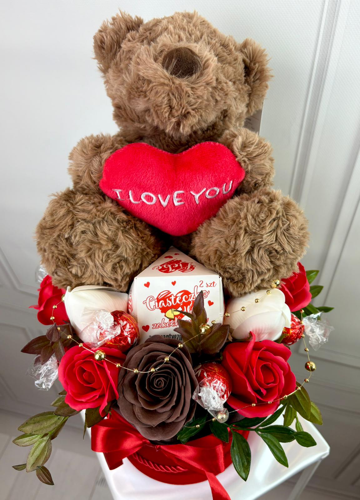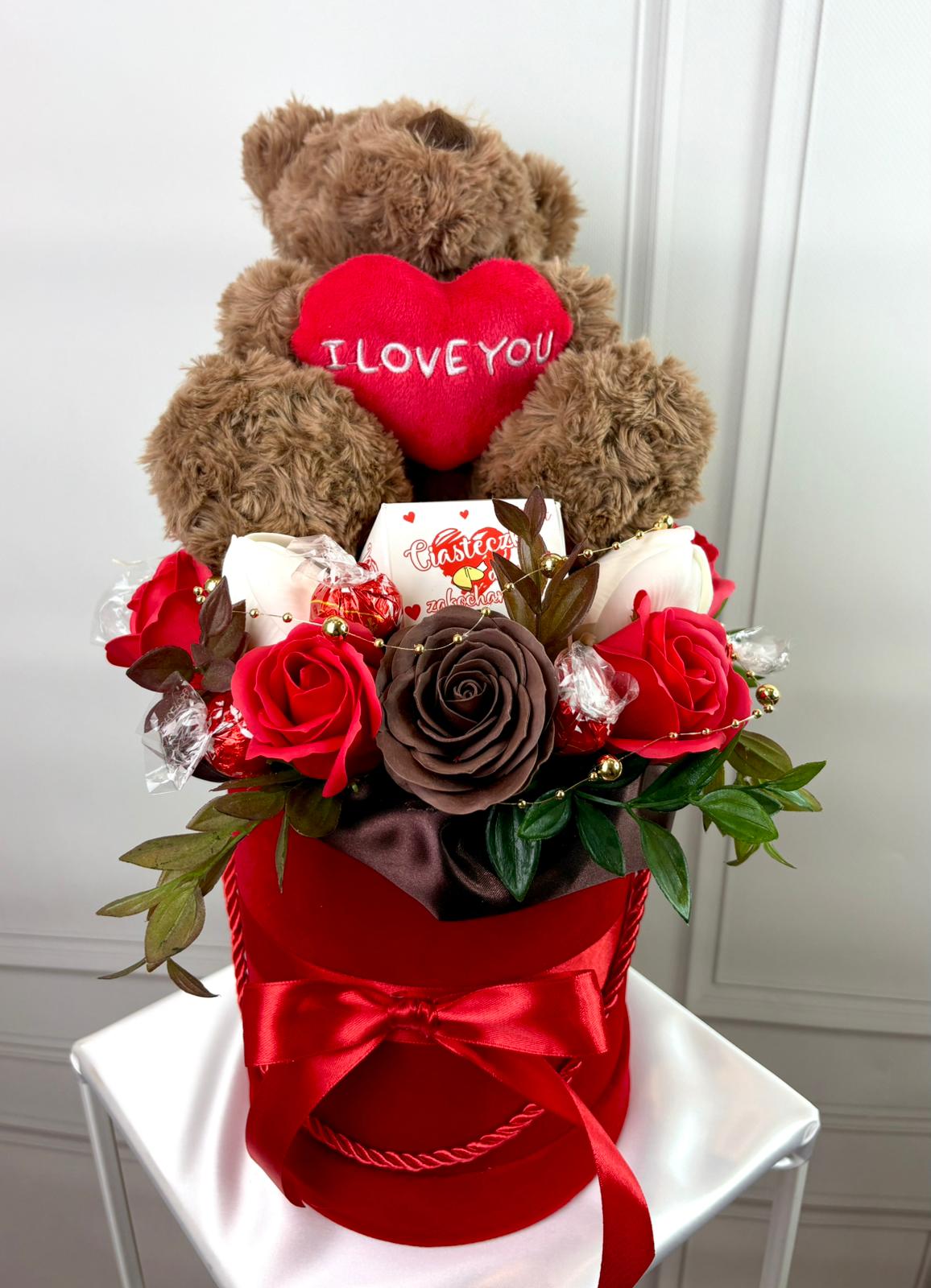 Efektowny duży box prezentowy w romantycznej kolorystyce czerwieni, brązu i zieleni. Kompozycja z dekoracyjnych mydlanych róż, słodkości oraz dużego pluszowego misia z sercem „I Love You” tworzy wyjątkowy i bardzo okazały prezent.