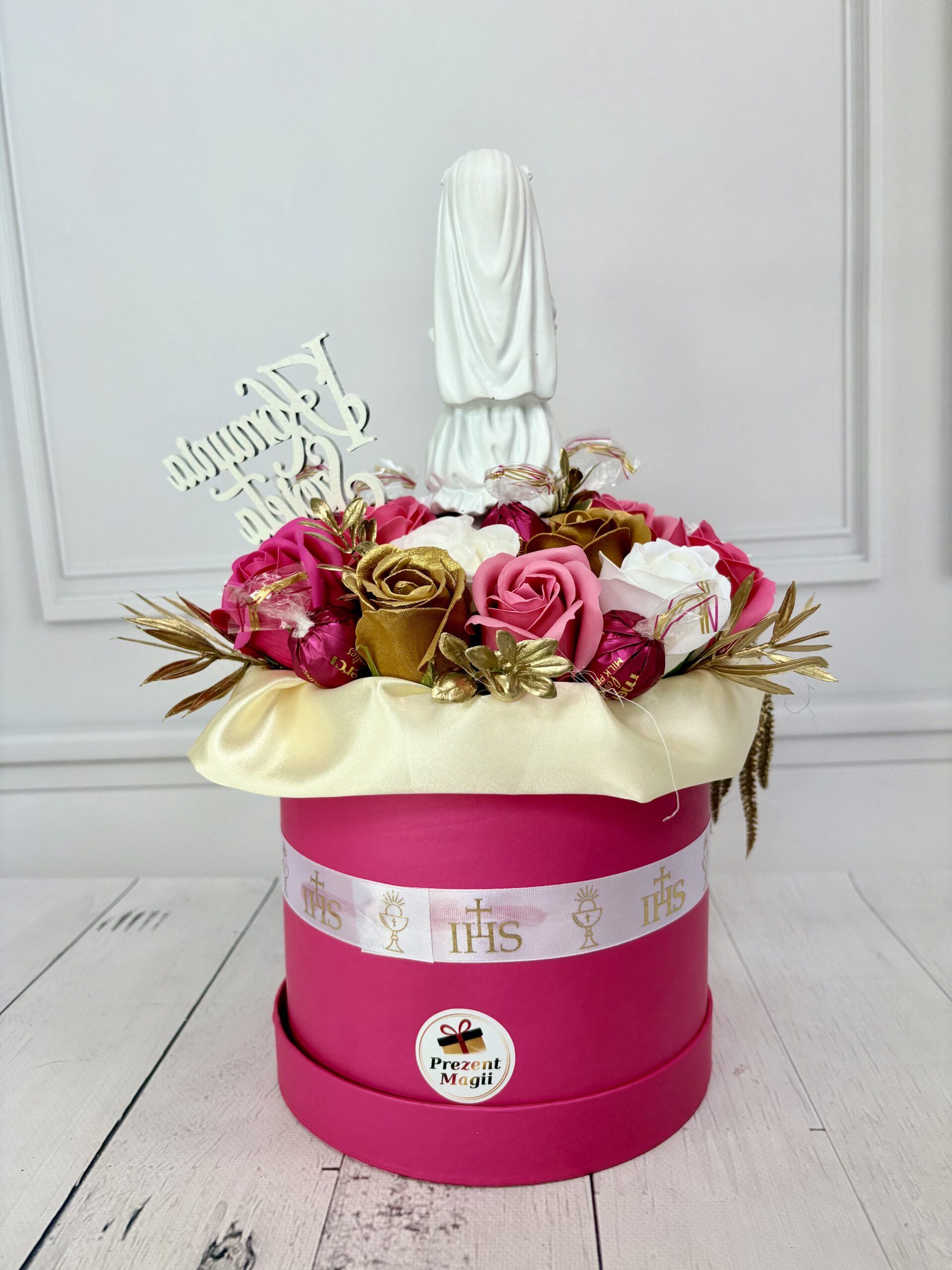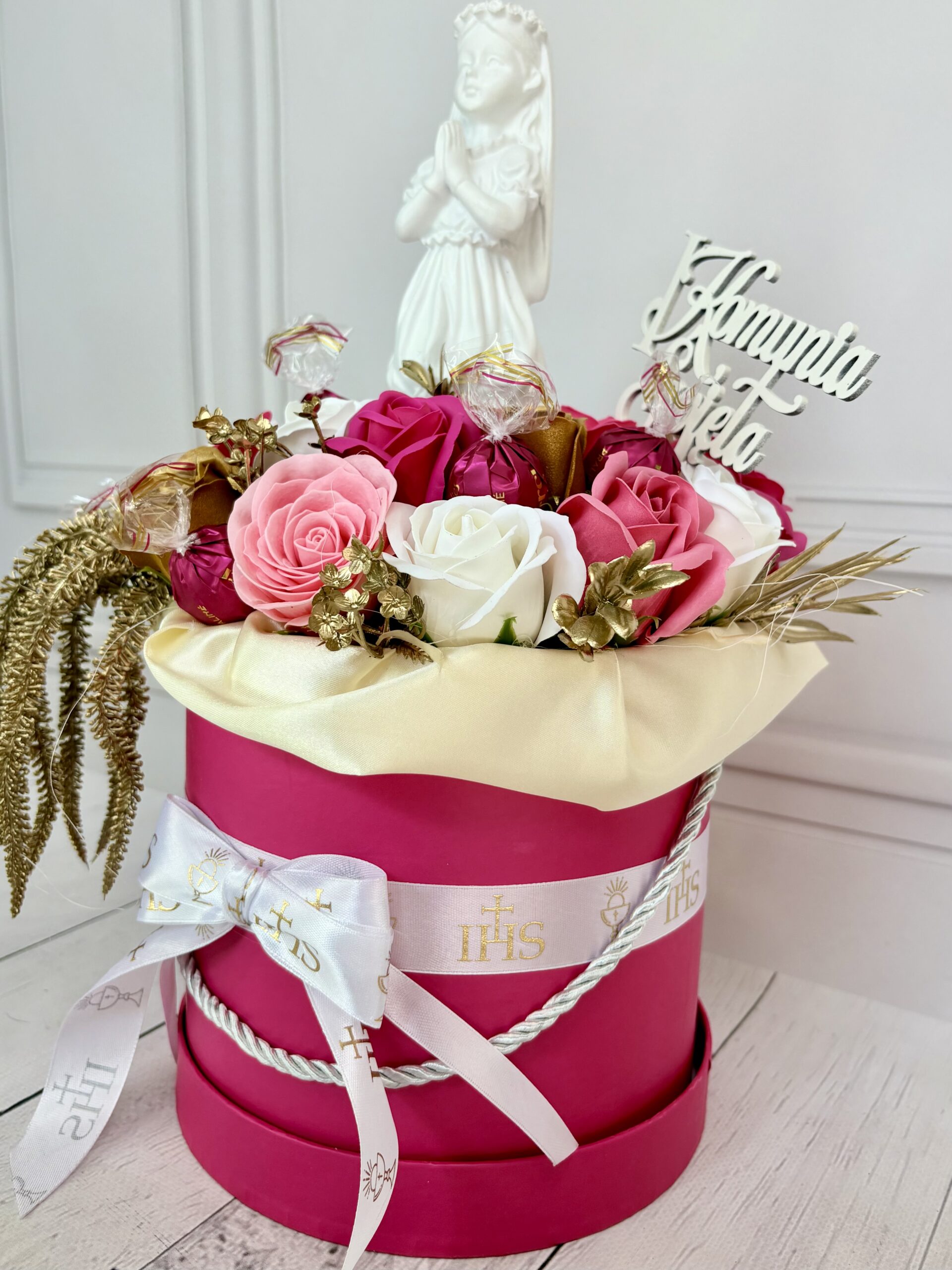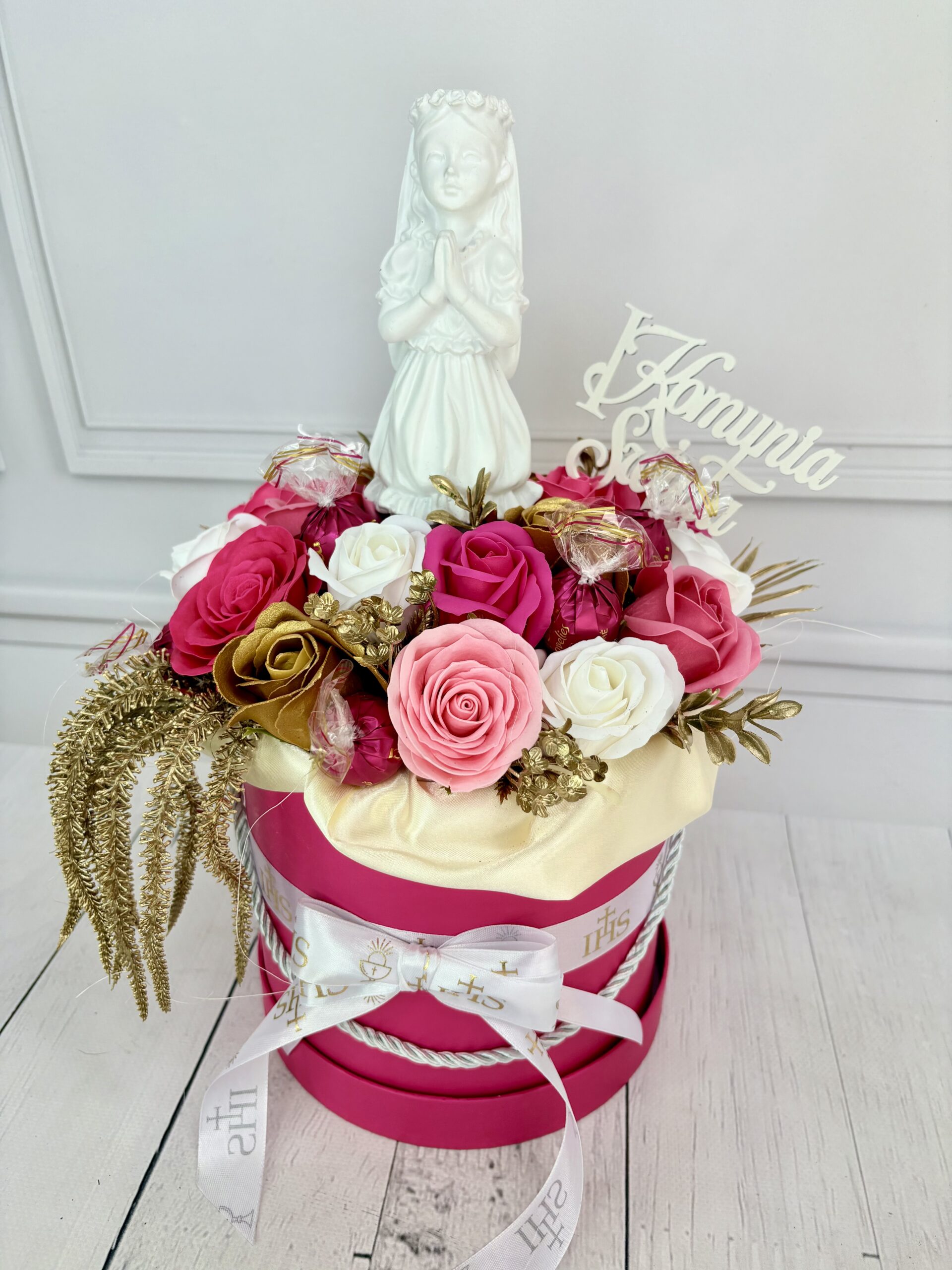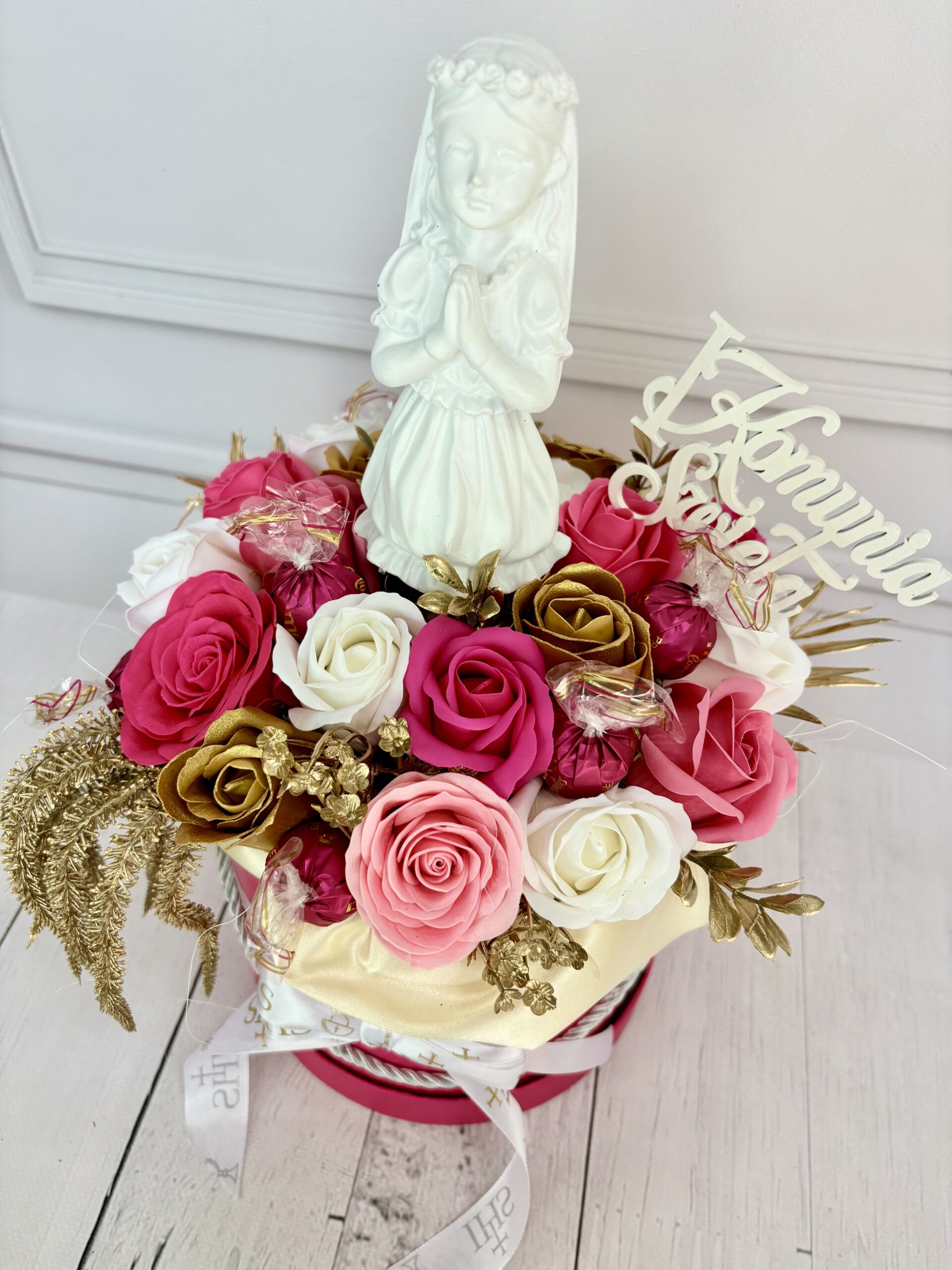 Wyjątkowy, ręcznie wykonany boks komunijny w eleganckiej kolorystyce różu, bieli i złota ✨