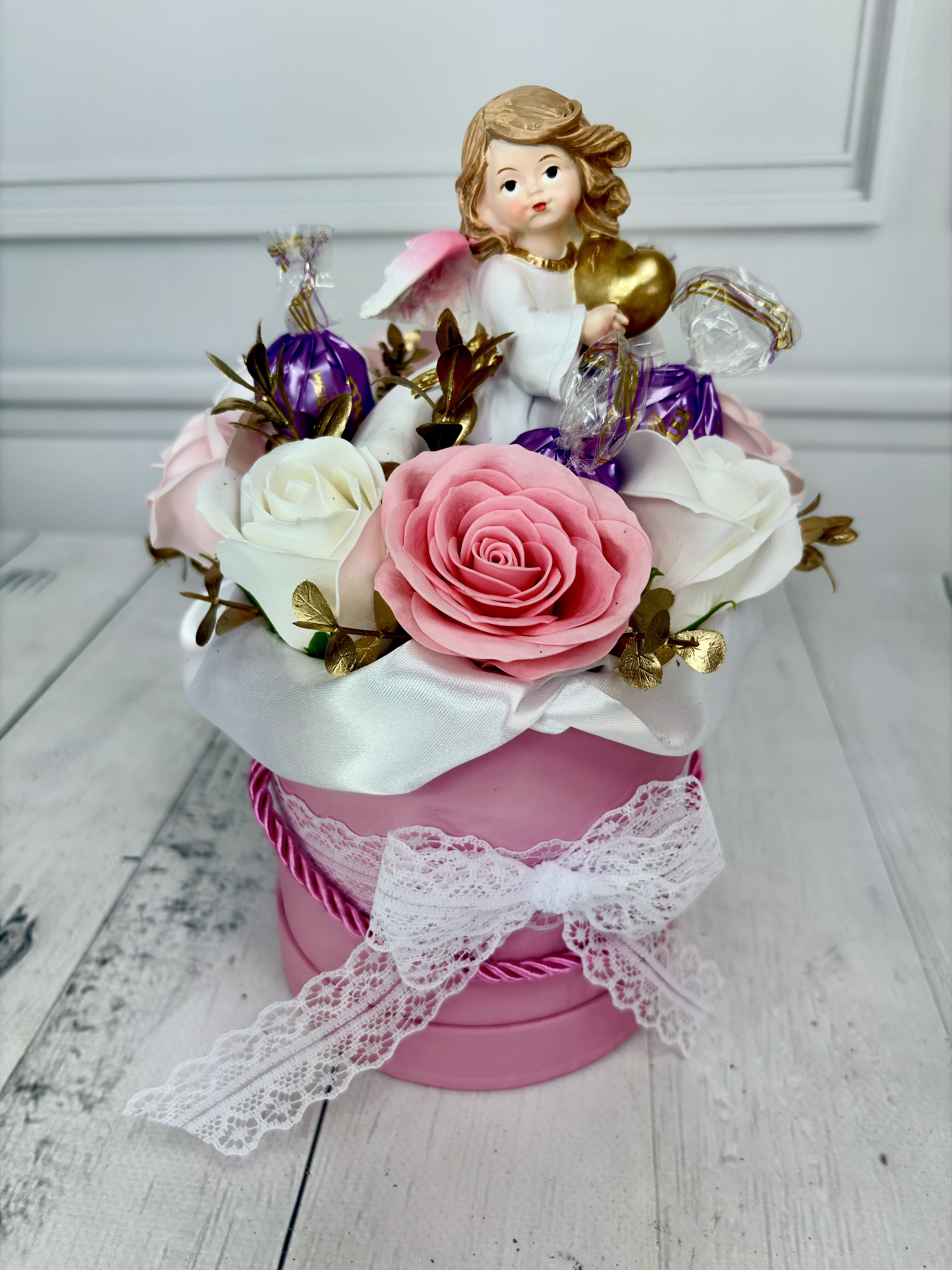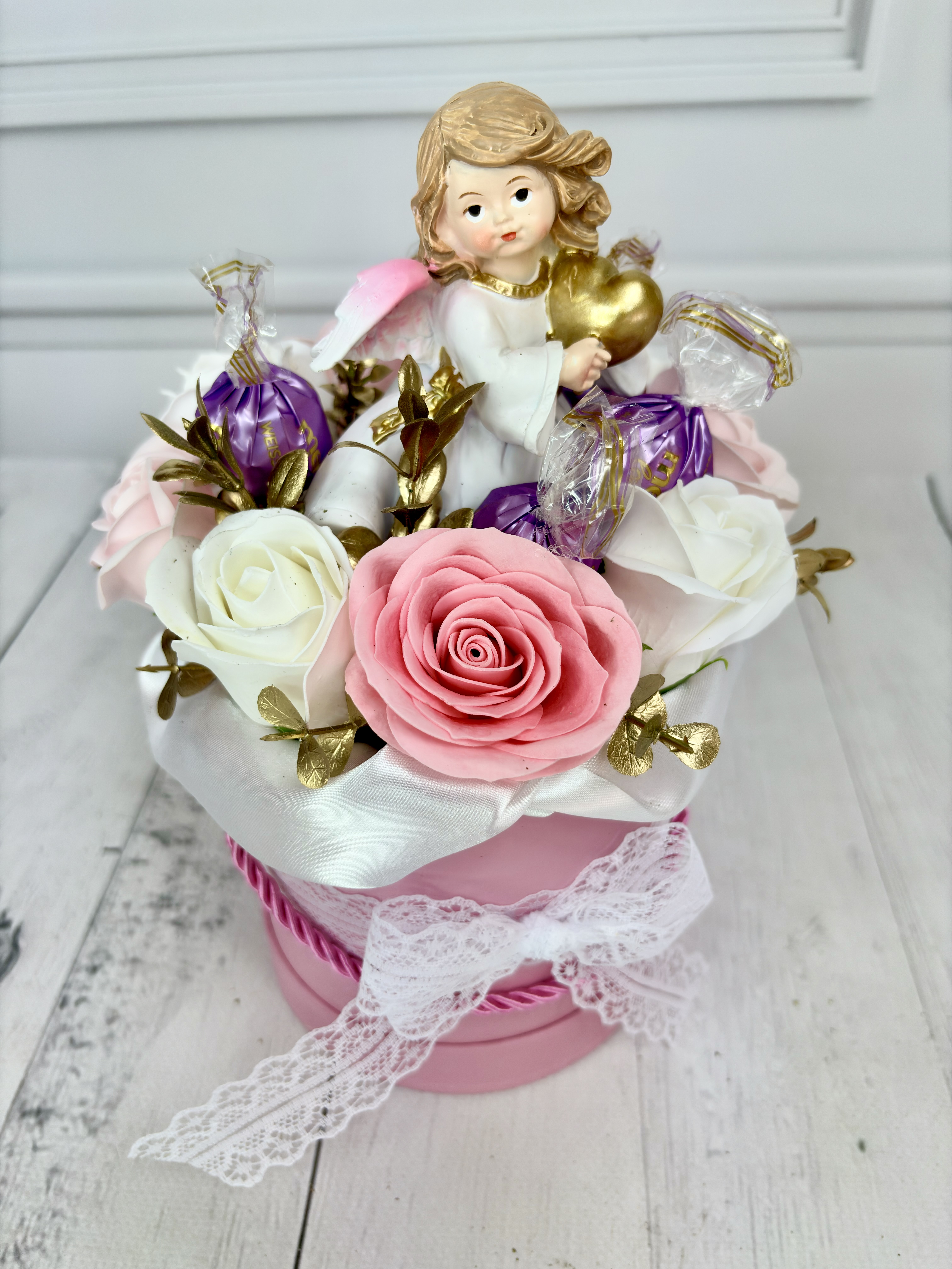 Centralnym elementem jest figurka aniołka, która nadaje całości ciepłego i wyjątkowego charakteru.